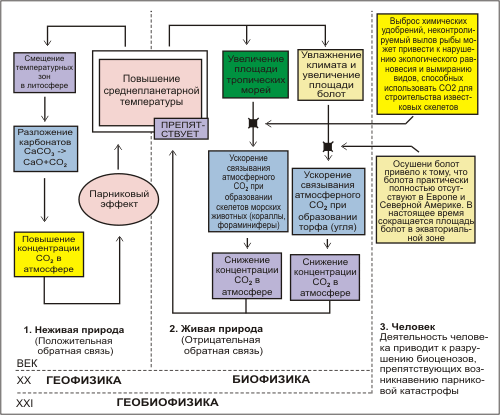 Показано, что в результате воздействия человека на природную среду могут быть нарушены естественные механизмы поддержания устойчивости химического состава атмосферы и теплового баланса Земли, что может привести к парниковой катастрофе [1,2]. Последствия такой парниковой катастрофы существенно более серьезны, чем последствия традиционно обсуждаемого парникового эффекта. В частности повышение температуры поверхности Земли может достигнуть 300 °С, что сделает невозможным существование жизни на Земле в ее современных формах [3-5]. Разработанная причинно-следственная диаграмма [3,4] парниковой катастрофы позволяет наметить пути предотвращения катастрофических изменений климата и создания концепции устойчивого развития цивилизации.