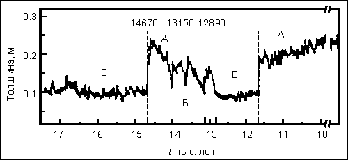 Одним из главных результатов, полученных при бурении ледника Гренландии в рамках проекта GISP-2 является тот факт, что переход от межледникового периода к оледенению и обратно происходит в течение нескольких (3-5) лет (Рис. 1) [1], а не в течение десятков или сотен лет, как это должно было бы быть в соответствии с ранее существовавшими теориями оледенения. Это потребовало создания новых моделей периодических оледенений Северного полушария.